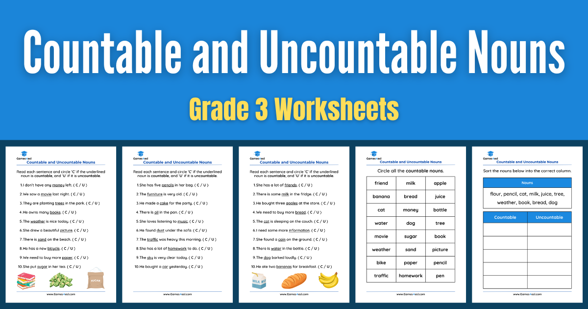 These worksheets are designed for grade 3 students to practice identifying and using countable and uncountable nouns. Countable nouns are those that we can count; they can be singular or plural. For example: “one pen, two pens, three pens,” etc. Uncountable nouns are those that cannot be counted, such as “water, sand, bread,” etc. Grade 3 students often find this concept quite challenging because it’s not always obvious which nouns can be counted and which cannot. For example, they may wonder why we say “a piece of bread” but not “two breads.” These worksheets give students plenty of structured practice so they can recognize countable and uncountable nouns and avoid common mistakes.