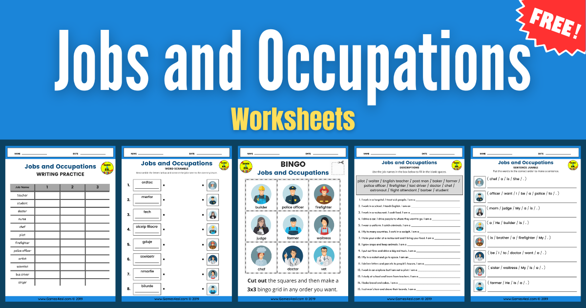 The worksheets below introduce job vocabulary and help students practice reading, spelling, and using common job-related expressions through fun activities and games. They’re ideal for kids and beginner ESL learners and work well for introducing job names and related vocabulary.