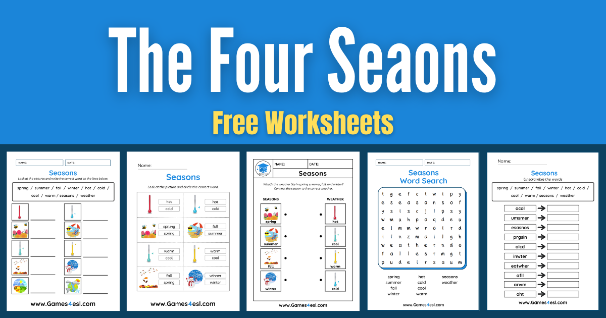 Introduce the vocabulary with our Seasons Flashcards and Seasons PowerPoint Lesson. If you’re teaching the four seasons as part of a larger unit, you might also like these Weather Worksheets.