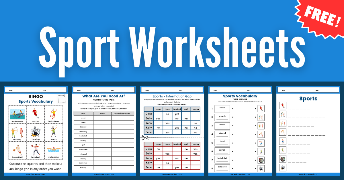 These sports worksheets are designed to help beginner ESL students learn the names of sports in English. Add them to your sports lesson plan to create a fun and interactive class. Below you’ll find vocabulary worksheets for practicing reading and writing sports words, plus speaking activities to get students making dialogues with questions like “Do you like tennis?” and “Are you good at soccer?”