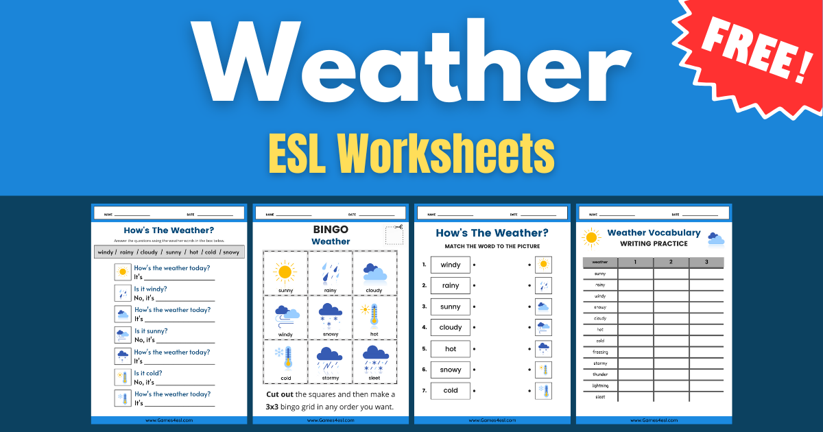 The video below is a fun Weather Guessing Game that you can use together with the worksheets above to make your lesson more exciting. It’s a simple guessing game in which students are asked, “How’s the weather?” and must then choose between two possible answers. Use it to warm up at the start of class or at the end for a fun review game.
