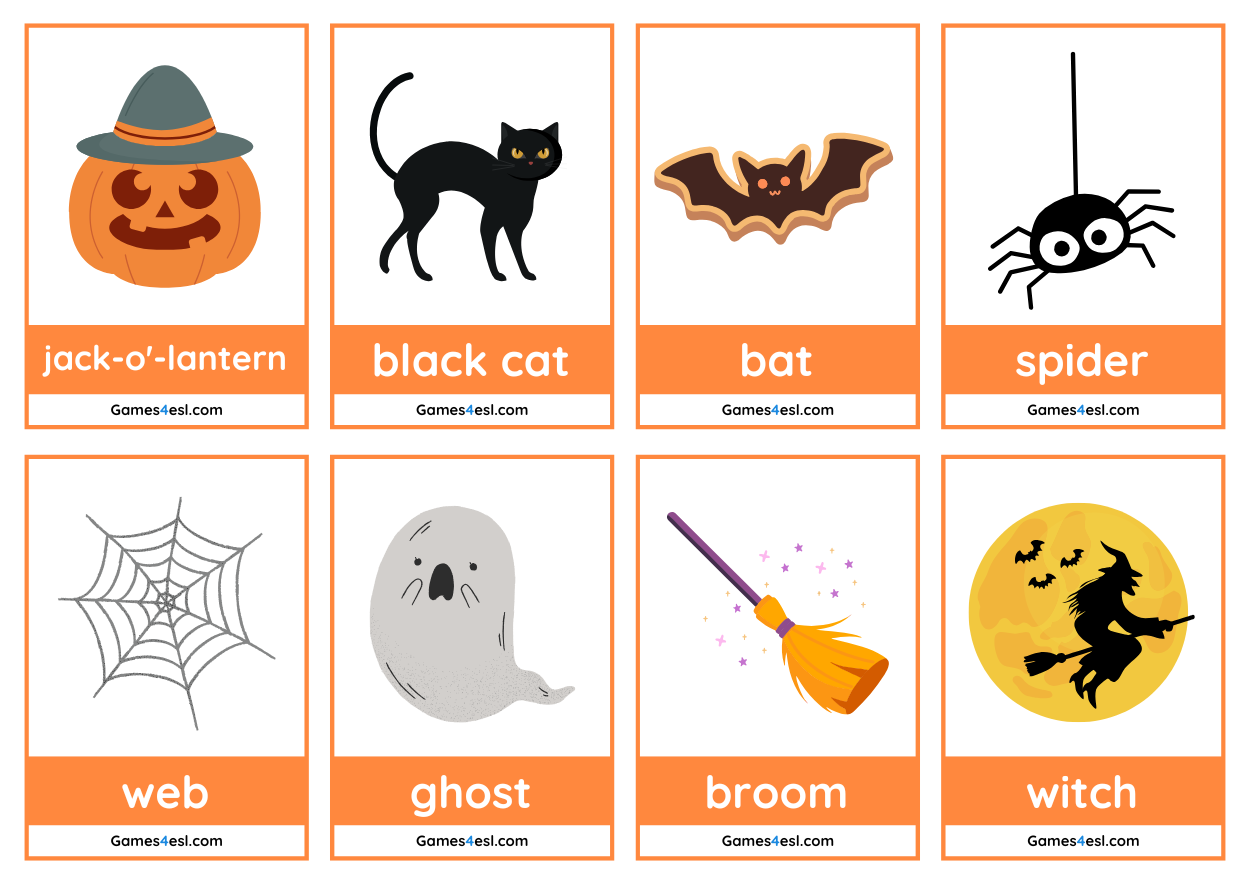 Use these free Halloween flashcards for kids to teach fun and spooky vocabulary to ESL learners. These Halloween-themed cards are perfect for introducing simple words like bat, witch, black cat, and more.