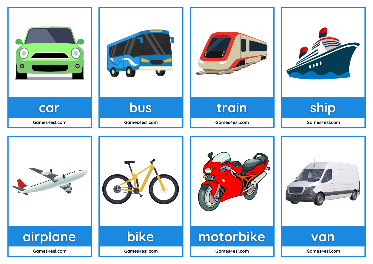 These free transportation flashcards are great for teaching ESL kids the names of different modes of transport in English. The set includes 16 small and 16 large flashcards featuring common vehicles such as car, bus, train, bicycle, airplane, and more.